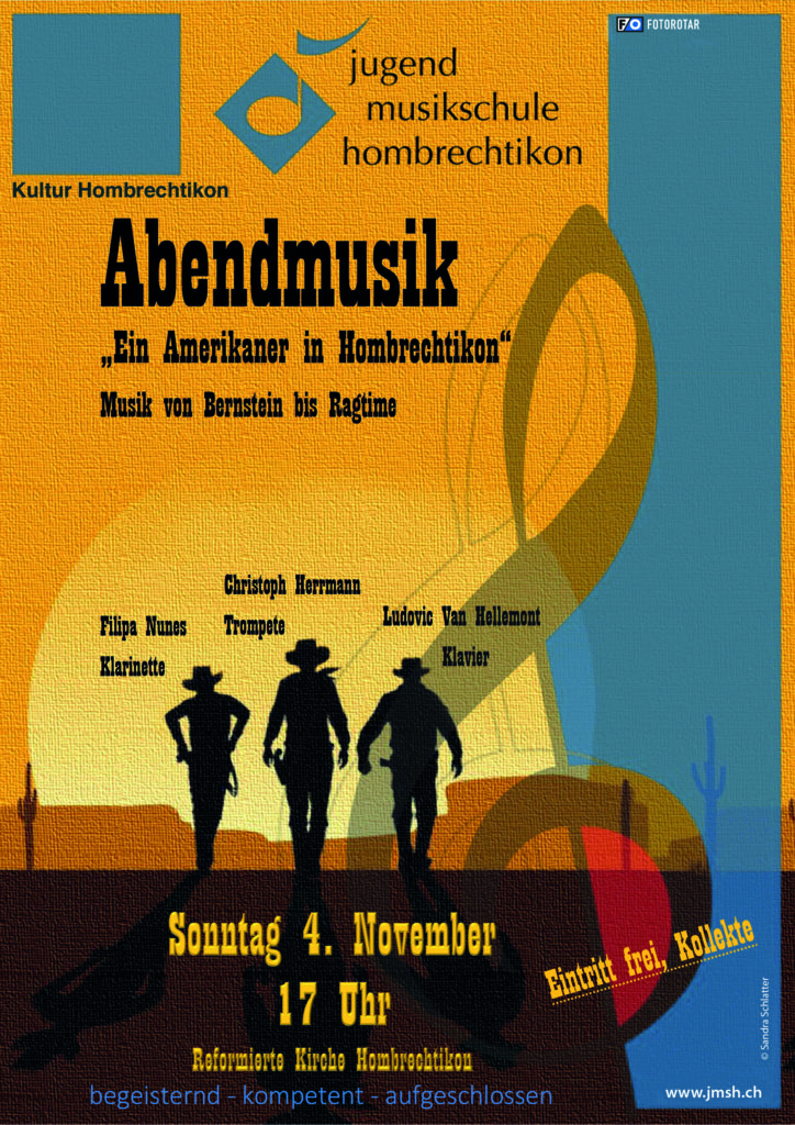 Am Sonntag, 4. November 2018, 17.00 Uhr lädt die Jugendmusikschule Hombrechtikon zum traditionellen Konzert mit Musiklehrpersonen in die Reformierte Kirche ein. Christoph Herrmann, Trompetenlehrer an der Jugendmusikschule Hombrechtikon, wird mit seinen beiden Kolleginnen Filipa Nunes (Klarinette) und Ludovic Van Hellemont (Klavier) die Zuhörerinnen und Zuhörer auf eine musikalische Reise in die «neue Welt» mit Werken von Bernstein bis Ragtime mitnehmen. Das Publikum darf gespannt sein, welche musikalischen Leckerbissen und Überraschungen sich hinter dem Konzert-Titel «Ein Amerikaner in Hombrechtikon» verbergen. Jedermann ist herzlich zu diesem Konzertabend eingeladen – der Eintritt ist frei, am Ausgang wird eine Kollekte erhoben.