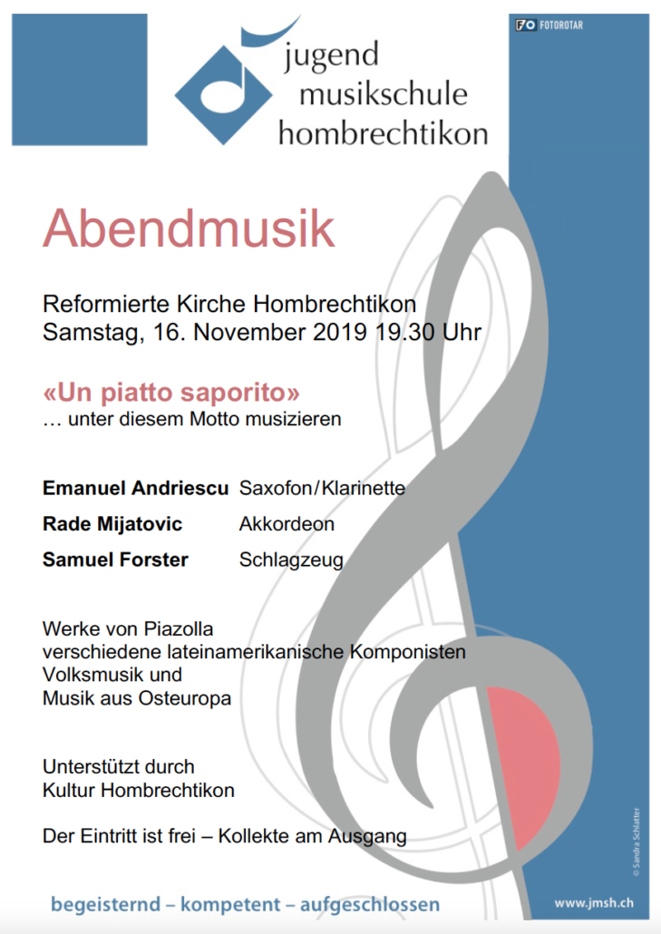 Am Samstag, 16. November 2019 um 19.30 Uhr lädt die Jugendmusikschule Hombrechtikon ganz herzlich zu einem weiteren Abendkonzert in die Reformierte Kirche Hombrechtikon ein. Der Saxophon- und Klarinettenlehrer Emanuel Andriescu – er ist an der Jugendmusikschule Hombrechtikon tätig – wird mit seinen zwei Musikerkollegen als Trio «Seraroma» ein buntes Programm mit Werken von Piazolla und anderen lateinamerikanischen Komponisten, aber auch mit Volksmusik und Musik aus Osteuropa als «un piatto saporito» servieren.