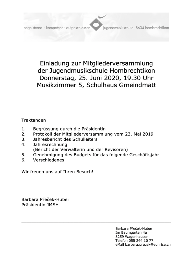 Wir laden herzlich zur Generalversammlung 2020 der JMSH ein