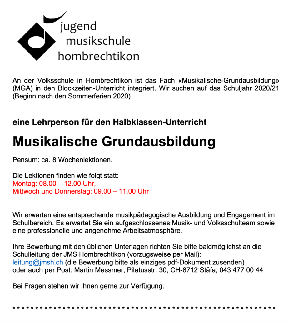 Die Jugendmusikschule Hombrechtikon sucht per August 2020 (nach den Sommerferien) eine Lehrperson für den Halbklassenunterricht im Fach Musikalische Grundausbildung (MGA).